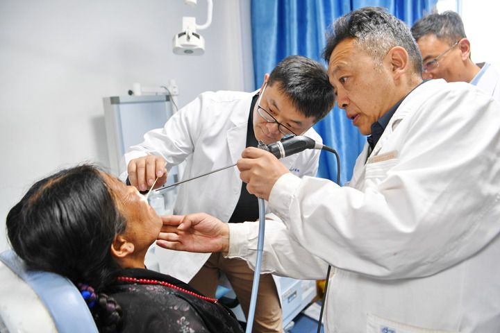 ??中國(guó)醫(yī)學(xué)科學(xué)院整形外科醫(yī)院王克明博士(左后)和西藏自治區(qū)人民醫(yī)院巴羅主任(右前)為患者查體(2024年8月27日攝)。新華社記者 張汝鋒 攝