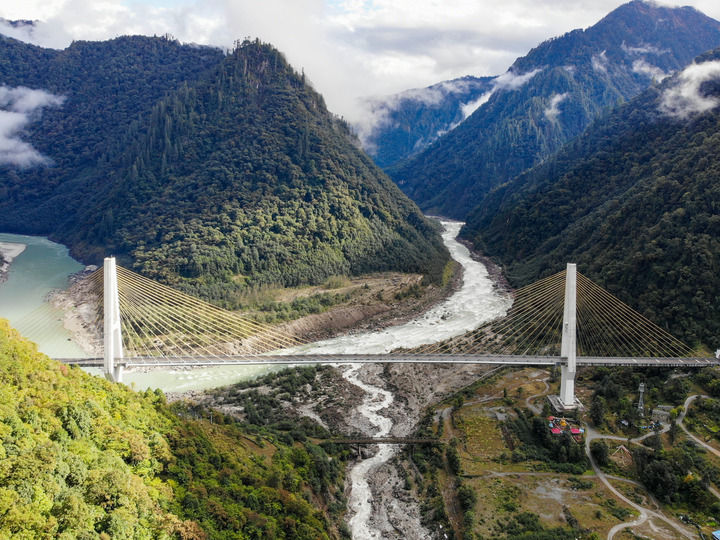 ??2019年10月27日拍攝的川藏公路通麥路段上的迫龍溝特大橋(無(wú)人機(jī)照片)。迫龍溝特大橋位于西藏林芝市波密縣境內(nèi),是西藏自治區(qū)內(nèi)最大的公路雙塔斜拉橋。新華社記者 孫非 攝