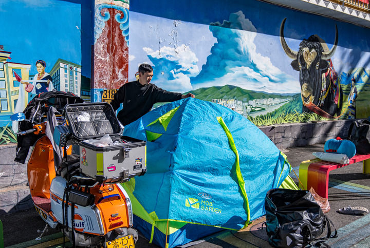 ??經(jīng)國(guó)道318線前往西藏旅游的重慶游客張靜在芒康縣如美鎮(zhèn)拉烏村整理帳篷(2023年10月20日攝)。新華社記者 孫非 攝