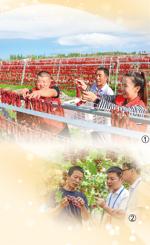 圖①:新疆維吾爾自治區(qū)博湖縣塔溫覺肯鄉(xiāng)辣椒曬場上,黨員志愿服務(wù)隊(duì)幫助村民晾曬辣椒。 |