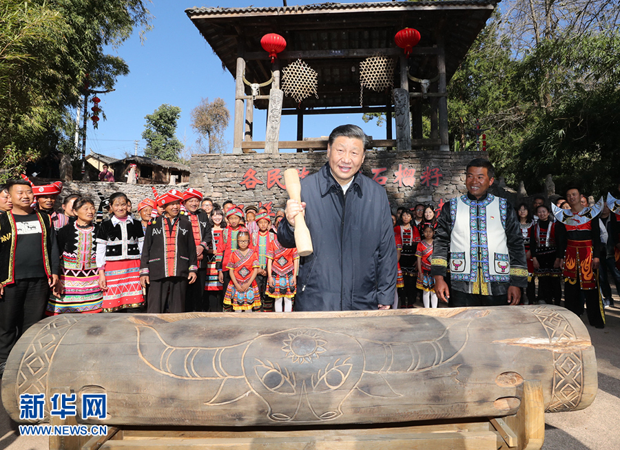 2020年1月19日至21日,中共中央總書記、國(guó)家主席、中央軍委主席習(xí)近平來到云南,看望慰問各族干部群眾,向全國(guó)人民致以新春祝福。這是19日下午,習(xí)近平在騰沖市清水鄉(xiāng)三家村中寨司莫拉佤族村廣場(chǎng)上,敲響三聲佤族木鼓,祝福來年風(fēng)調(diào)雨順、國(guó)泰民安。 新華社記者 鞠鵬 攝