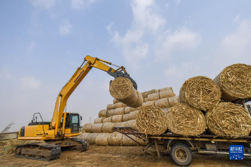 2020年11月12日,在吉林省四平市福港秸稈收儲(chǔ)有限公司,農(nóng)業(yè)機(jī)械搬運(yùn)打包好的秸稈。新華社記者 張楠 攝