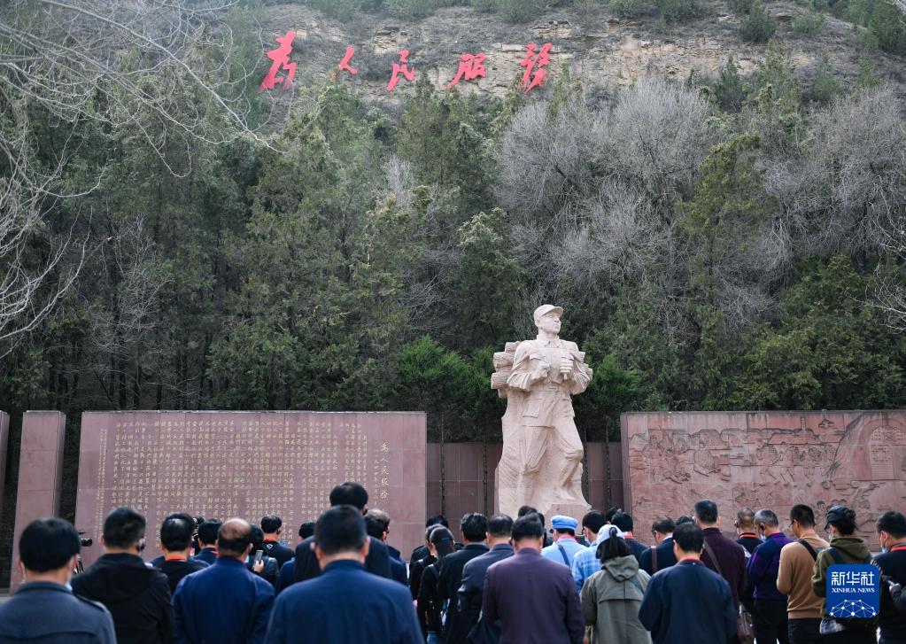 黨員干部在陜西省延安市張思德廣場進(jìn)行現(xiàn)場教學(xué)活動(dòng)(3月29日攝)。新華社記者 張博文 攝