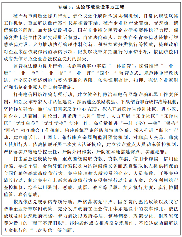 嚴(yán)格執(zhí)行保護(hù)企業(yè)產(chǎn)權(quán)的司法政策,合理劃定責(zé)任財(cái)產(chǎn)范圍,重點(diǎn)解決國(guó)有資產(chǎn)流失、利用公權(quán)力侵害私有產(chǎn)權(quán)等產(chǎn)權(quán)保護(hù)中的突出問(wèn)題。嚴(yán)格區(qū)分經(jīng)濟(jì)糾紛與經(jīng)濟(jì)犯罪,依法慎用刑事強(qiáng)制措施,嚴(yán)格規(guī)范涉案企業(yè)財(cái)產(chǎn)的保全和處置措施。依法平等保護(hù)各類市場(chǎng)主體,對(duì)企業(yè)負(fù)責(zé)人少捕慎訴慎押。健全涉企產(chǎn)權(quán)冤錯(cuò)案件有效防范和常態(tài)化糾錯(cuò)機(jī)制,加大企業(yè)產(chǎn)權(quán)冤錯(cuò)案件賠償決定執(zhí)行力度。強(qiáng)化善意文明執(zhí)行理念,嚴(yán)禁超標(biāo)的查封、亂查封,建立健全查封財(cái)產(chǎn)融資償債和自行處置機(jī)制。加強(qiáng)數(shù)字貨幣、網(wǎng)絡(luò)虛擬財(cái)產(chǎn)、數(shù)據(jù)等新型權(quán)益保護(hù)。依法保護(hù)股東特別是中小股東的知情權(quán)、參與權(quán)、收益權(quán)、求償權(quán)等合法權(quán)利。暢通投資者維權(quán)渠道,推動(dòng)加強(qiáng)在線咨詢等工作,加快投資者維權(quán)從“線下跑”向“網(wǎng)上辦”轉(zhuǎn)變。強(qiáng)化上市公司監(jiān)管,提高上市公司透明度。全面開展打擊電信網(wǎng)絡(luò)詐騙專項(xiàng)行動(dòng),聚焦“抓防范、強(qiáng)治理、降發(fā)案”,升級(jí)完善省、市、縣三級(jí)反詐中心,注重縣域高發(fā)類案件和大要案件集中攻堅(jiān)的資源技術(shù)支撐,著力構(gòu)建誠(chéng)信社會(huì)環(huán)境。全面開展打擊惡意逃廢債專項(xiàng)行動(dòng),重點(diǎn)打擊騙取貸款、金融憑證詐騙、拒不履行法院判決裁定等違法犯罪行為,努力營(yíng)造良好金融生態(tài)。全面開展依規(guī)依法兌現(xiàn)承諾專項(xiàng)行動(dòng),嚴(yán)格落實(shí)惠民政策和幫助企業(yè)紓難解困政策,建立健全“政府承諾+社會(huì)監(jiān)督+失信問(wèn)責(zé)”機(jī)制,重點(diǎn)整治“新官不理舊賬”等政務(wù)失信問(wèn)題。