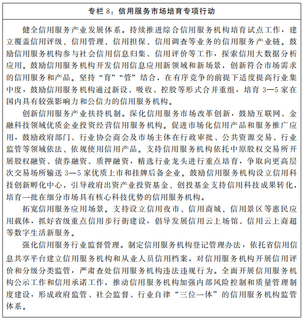 加速培育壯大一批具有較強(qiáng)市場(chǎng)公信力和影響力的信用服務(wù)機(jī)構(gòu),打造一批特色鮮明、相對(duì)集聚的信用服務(wù)產(chǎn)業(yè)園區(qū),形成強(qiáng)大的信用生態(tài)鏈。加強(qiáng)信用服務(wù)機(jī)構(gòu)引進(jìn)來(lái)和“走出去”,引進(jìn)國(guó)內(nèi)外知名信用服務(wù)機(jī)構(gòu),設(shè)立省級(jí)征信公司,鼓勵(lì)省內(nèi)信用服務(wù)機(jī)構(gòu)參與國(guó)內(nèi)跨區(qū)域信用合作和國(guó)際競(jìng)爭(zhēng),增加高水平信用服務(wù)供給,提升信用服務(wù)機(jī)構(gòu)規(guī)模優(yōu)勢(shì)。
