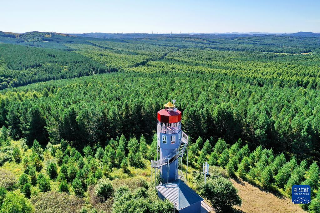 河北塞罕壩機(jī)械林場(chǎng)內(nèi)的望海樓(2021年8月23日攝,無人機(jī)照片)。新華社記者 牟宇 攝