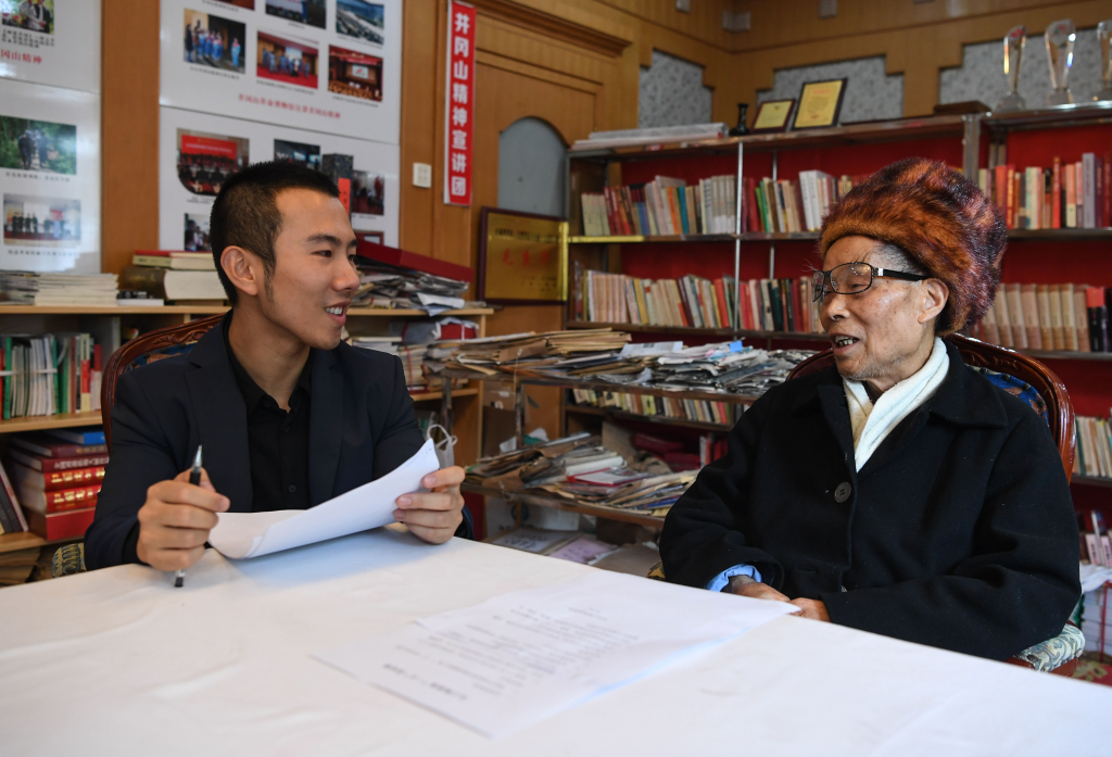 毛秉華(右)生前和孫子毛浩夫?qū)W習、探討井岡山革命歷史。新華社記者申宏攝