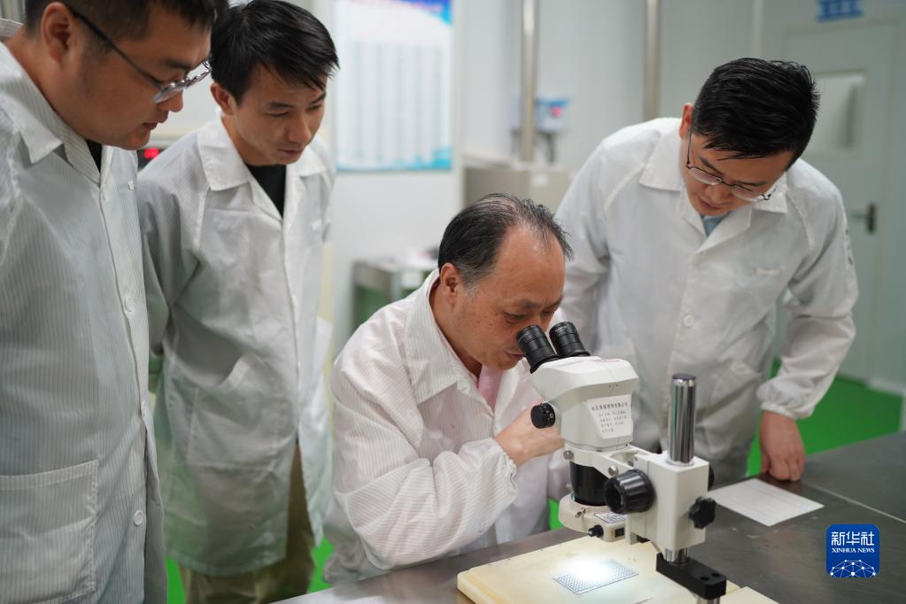 江風(fēng)益在位于南昌高新區(qū)的實驗室內(nèi)與團隊成員一起工作(2022年8月5日攝)。新華社記者 周密 攝