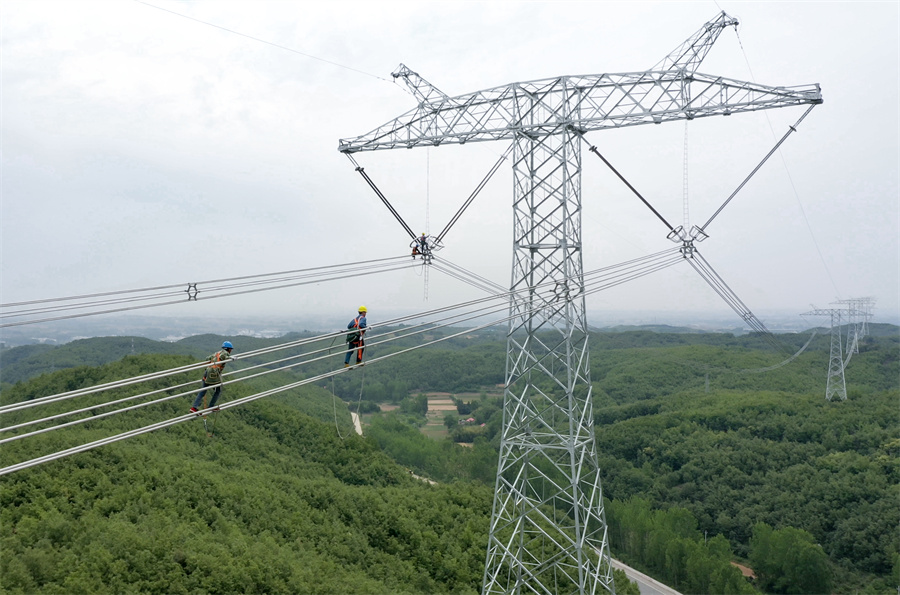 ??國(guó)網(wǎng)河南省電力公司員工在±800千伏青豫特高壓工程西陜段進(jìn)行線(xiàn)路檢修。