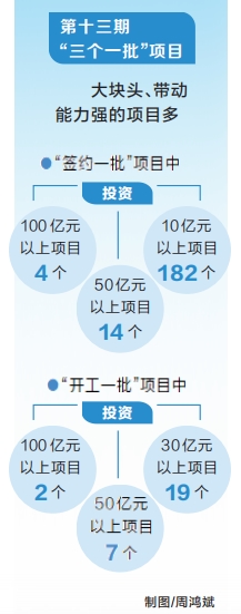 分析第十三期“三個(gè)一批”項(xiàng)目,從投資額度看,大塊頭、帶動能力強(qiáng)的項(xiàng)目多。本期活動“簽約一批”項(xiàng)目中投資100億元以上項(xiàng)目4個(gè)、50億元以上項(xiàng)目14個(gè)、10億元以上項(xiàng)目182個(gè);“開工一批”項(xiàng)目中投資100億元以上項(xiàng)目2個(gè)、50億元以上項(xiàng)目7個(gè)、30億元以上項(xiàng)目19個(gè)。